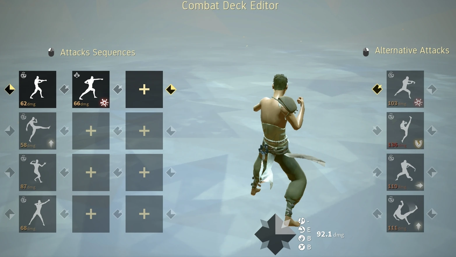 The Combat Deck is the players' series of attacks. It is customisable through the Combat Deck Editor and is comprised of four stances. More combat deck slots will be available as the player progresses in level. Each stance can string multiple attacks regardless of combat style however some attacks are unavailable based on which stance the previous attack finishes or which stance begins the series.